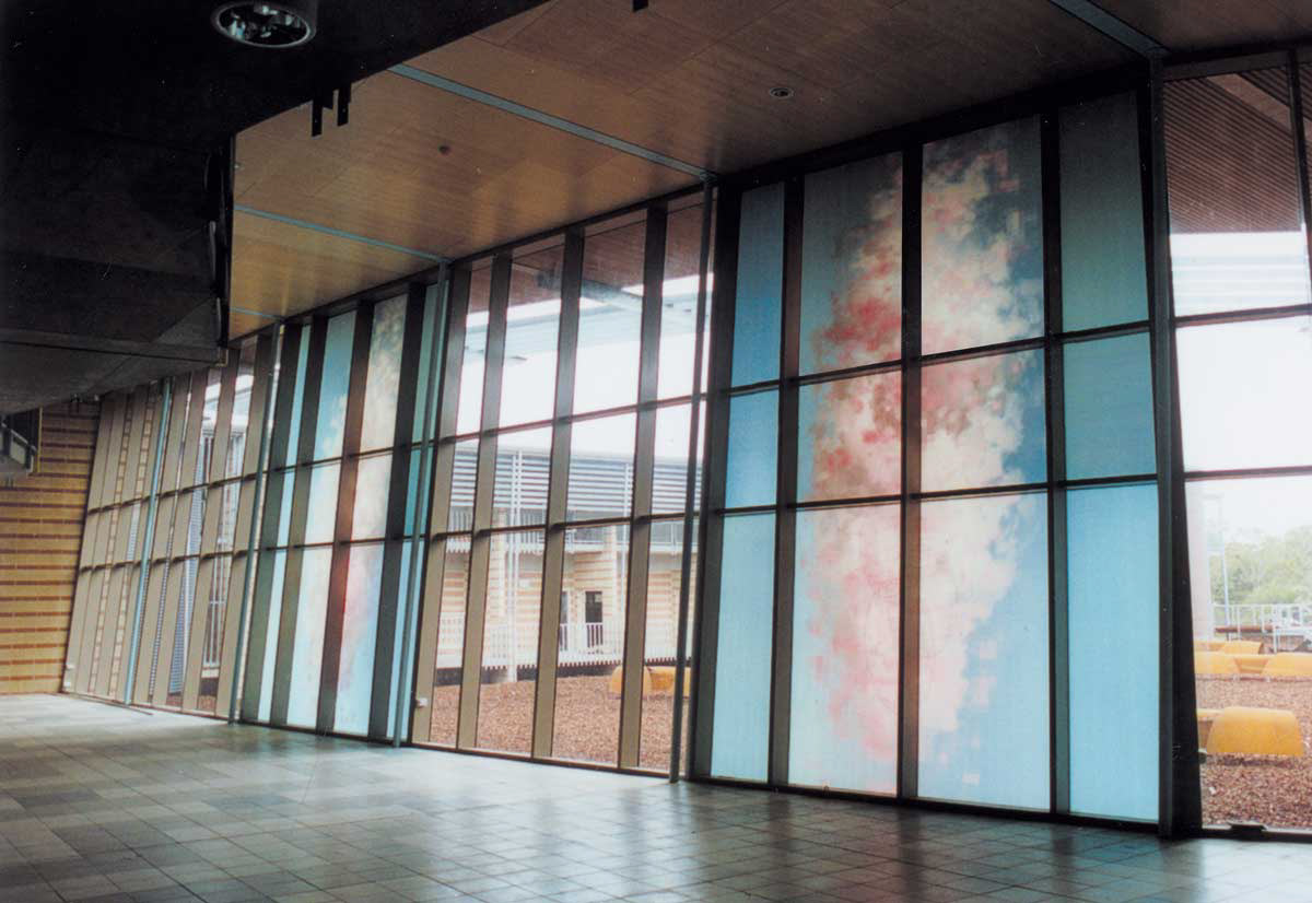 This work was commissioned for a new campus of Cooloola Sunshine Institute of TAFE and the architect asked for work to relate to the external environment. The work relates to the atmospheric quality of the sub-tropical climate on the Sunshine Coast and causes an awareness of environment as the images change according to external or internal light.